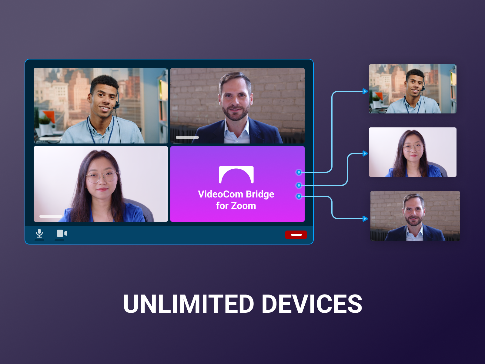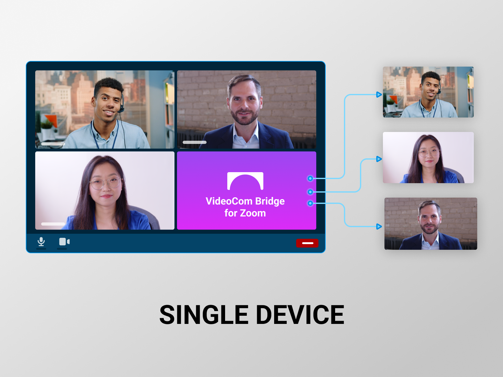 VideoCom Bridge for Zoom makes it very easy to get a clean videofeed of each of your Zoom conference participants. • For a single device • Yearly or Monthly Subscription